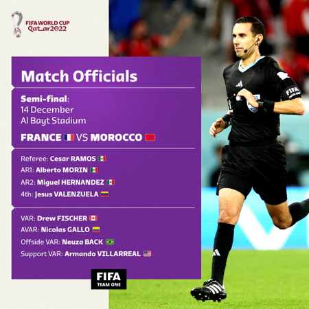Durante el encuentro entre Francia y Marruecos, César Arturo Ramos Palazuelos se desempeña como silbante internacional.