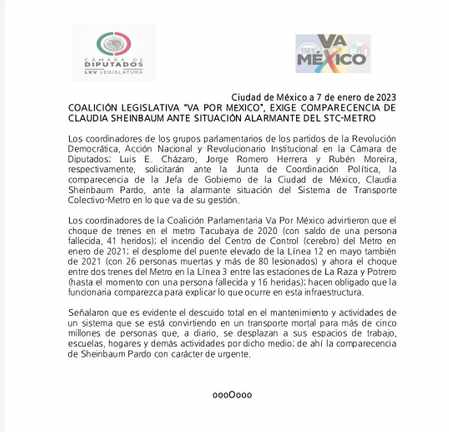 La coalición legislativa Va por México dio a conocer que solicitará urgentemente la comparecencia de la Jefa de Gobierno de la Ciudad de México, Claudia Sheinbaum Pardo,“ante la alarmante situación del Sistema de Transporte Colectivo-Metro en lo que va de su gestión.”